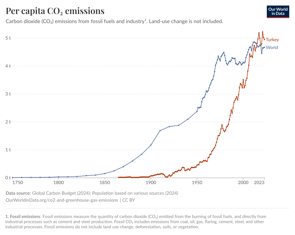 Türkiye için ise bu veri 2023 yılında 5 t CO2e olarak ölçülmüş.